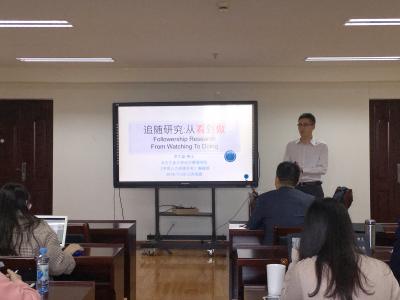 当日下午,北方工业大学罗文豪博士则以追随力的研究作为出发点,向与会硕博研究生介绍了当前国内外有关追随研究的现状和未来发展方向,并提出做文献综述的五点要求与大家共勉。之后结合其自身研究论文的实验设计为大家分享了如何做追随研究。最后,罗文豪博士引用论语中“取乎其上,得乎其中;取乎其中,得乎其下;取乎其下,则无所得矣”一语与在座师生共勉。